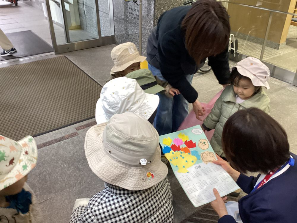 お礼にとシールとカレンダーをいただき、嬉しそうな園児たち!