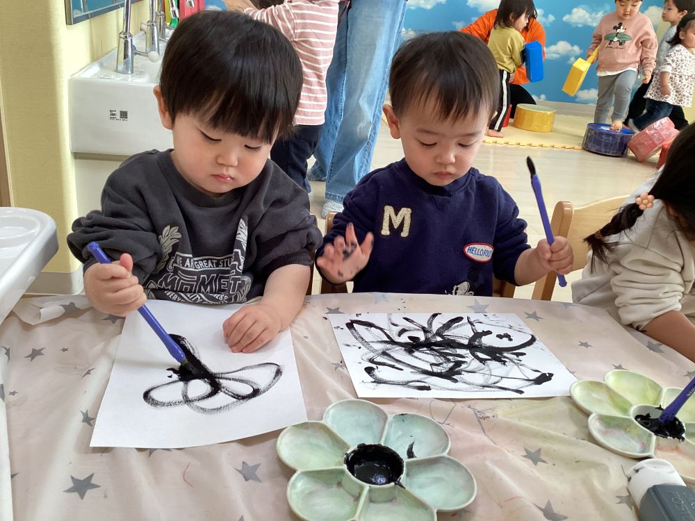 筆と黒い絵の具を使って、絵の具遊びを楽しみました。