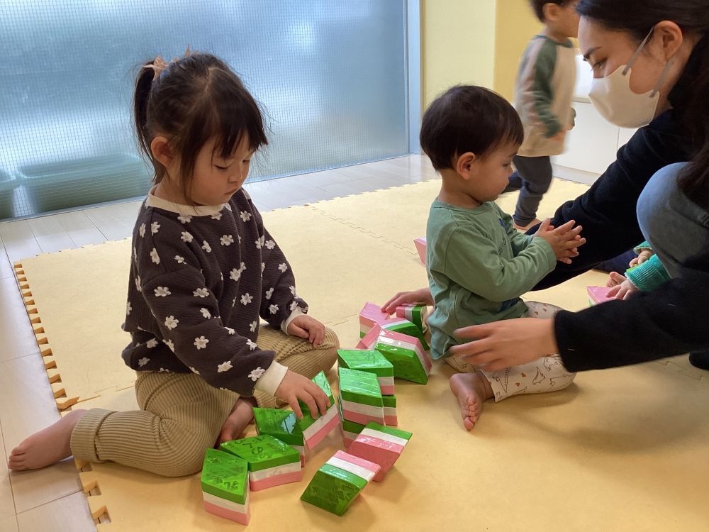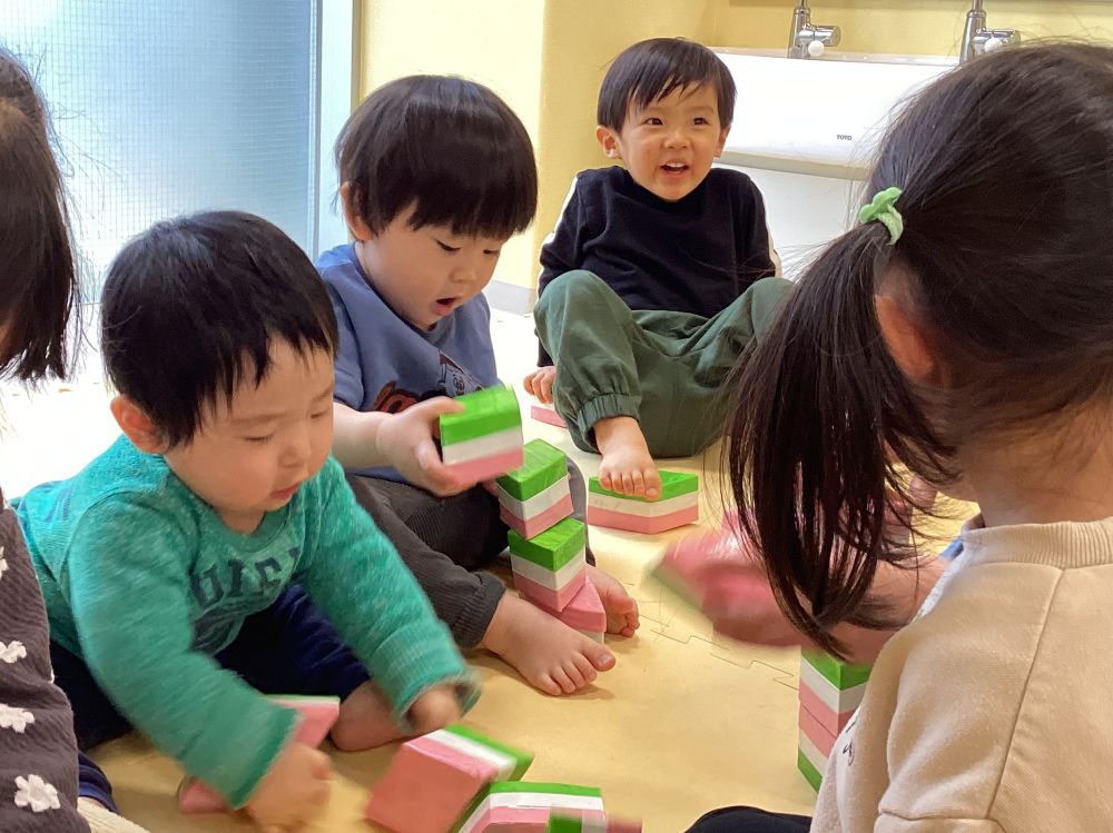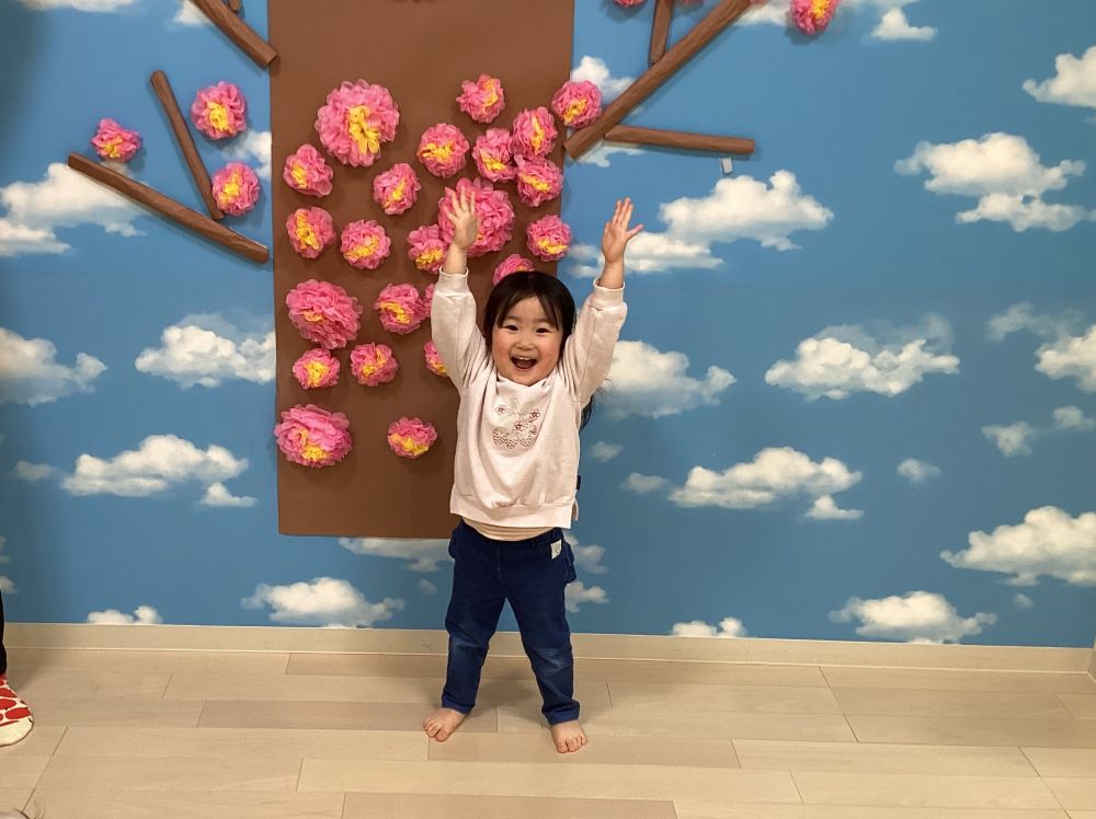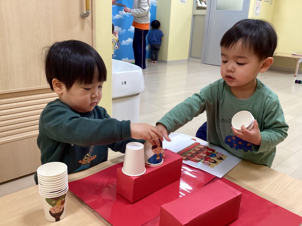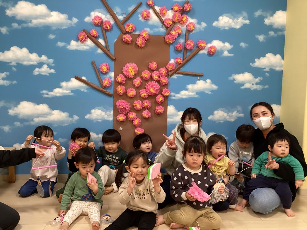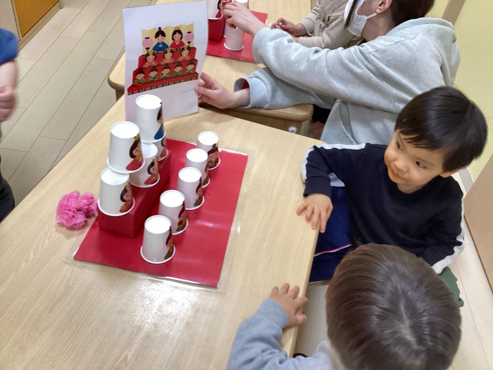 活動は『菱餅積みゲーム』『紙コップで雛壇作り』『桃の花探し』をしました。