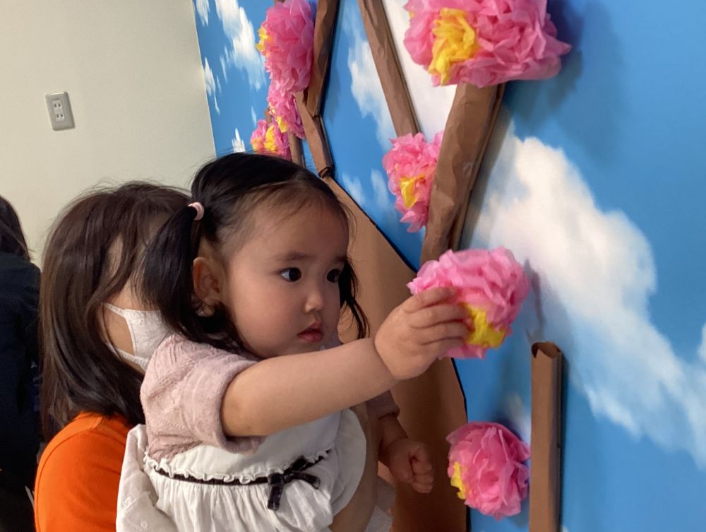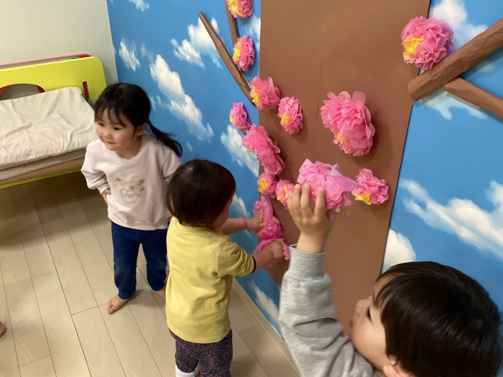 『桃の花探し』は、お部屋の中に隠されてあるお花を見つけて木にペタペタ♪
